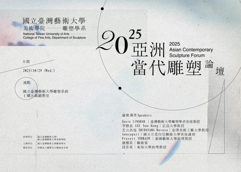 國立臺灣藝術大學雕塑學系自 2018 年起,為增進與亞洲各高等藝術院校之間的雕塑創作與研究交流,持續籌劃多元形式的國際交流活動。本次「2025 亞洲當代雕塑論壇」邀請活躍於亞洲當代藝術領域中的雕塑創作者與學者彼此對話。論壇特別邀請新加坡藝術家、策展人,也是本系今年度客座教授──蘇西・琳翰博士發表專題演講,並接續一系列的藝術家講座,邀請到芝山昌也(日本)、康雅筑(臺灣)、段存真(臺灣)、李樹泓(韓國)、阿努薩帕蒂(印尼)、帕色.約卡歐(泰國)等六位藝術家,分享各自的創作實踐與觀點。講者將從物體、材料、觸覺、過程與風景等不同面向出發,對亞洲當代雕塑的多元面貌提出新的思考與想像。